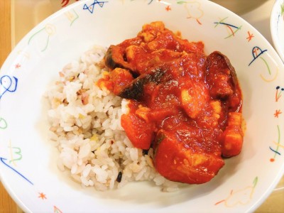 今日は港区商店街グランプリで区長賞を受賞した、「びのぐらーちぇ」さんのチキンのトマト煮が出ました。港区三田にあるお店では、雑穀ご飯の上にチキンのトマト煮をかけて食べるそうです。給食でも同じように再現しました。