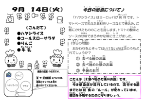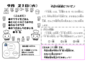 9月21日は十五夜です。この日には、秋の収穫を祝い、芋や団子をお供えして、月見をする風習があります。給食でも、旬のさつま芋を使ったご飯と白玉団子のすまし汁が出ました。汁には、可愛いうさぎのかまぼこが入っています。