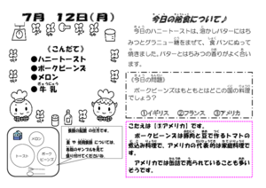 7月7日は七夕です。この日は、七夕の行事食である「ちらしずし」と、天の川をイメージした「そうめん汁」が出ました。そうめん汁にはピンクや水色・紫といった色とりどりの星麩を使い、天の川に輝く星々に見立てています。
