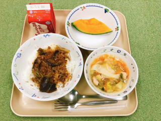 21日はいつものカレーと違って、和風だしや醤油を使った和風カレー丼です。見た目はカレーライスですが、味はカレーうどんのような感じでおいしくいただきました。
