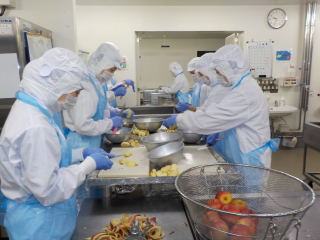 皮をむいたりんごはバットにきれいに並べます。1列10個で再確認するときなどにも数えやすい様に並べます。作業の時短につながり数の間違えも防げます。現場は細かいことの積み重ねでスムーズに動いています。