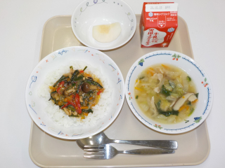 スタミナ丼にはたまねぎとピーマン・たけのこを使い、具だくさんスープには白菜・大根・人参・小松菜と野菜をたくさん使いました。野菜の量は165gになっています。サラダやおひたしにすると残菜が多いので具だくさんスープでやさいを摂る方が自然と残さず食べてくれるのかもしれません。寒くなるこれからはスープが大活躍するでしょう。
