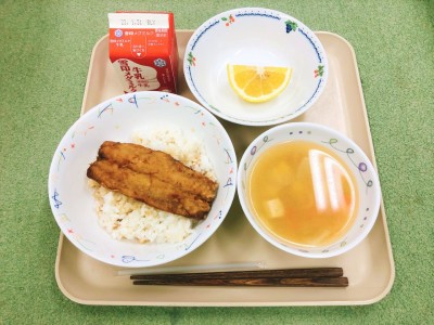 今日は、郷土料理の「鯨の竜田揚げ」と「呉汁」の給食です。鯨は1980年代までは給食でもよく登場していましたが、今では年に1回程度しか食べることができない貴重な食材です。鯨は生姜・にんにく・りんごのすりおろしで臭みをとり、酒と醤油で下味をつけ、竜田揚げにしました。